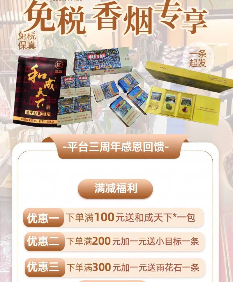 ☺️ 免税香烟shop从21年营业至今,得到了大量客户的好评以及回购!我们深知大家赚钱都不容易,所以一直努力把价格控制在能力范围内的最低水平 💰️ 🔥 为什么我们能运营这么久还能保持低价?因为我们就是香烟圈的拼多多啊!主打的薄利多销、老客户回购以及大客户整件拿货 🚬 💪 现在为了平台进一步发展壮大,我们推出了三个超级给力的活动,每个活动都是实实在在的福利,不玩虚的!